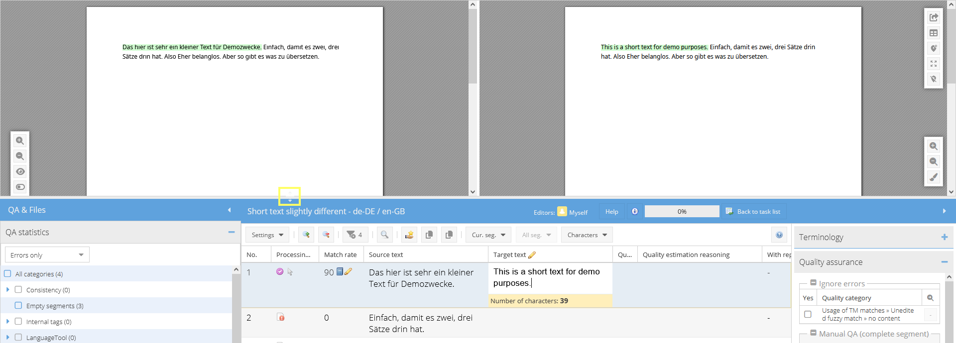 The Visual display allows you to view a document’s content in the original layout while translating or reviewing it. For this purpose, not only the source files are imported into translate5 when the project is created, but also a graphically designed version of the source files or a URL list. The following formats are accepted for the WYSIWYG version of the content: