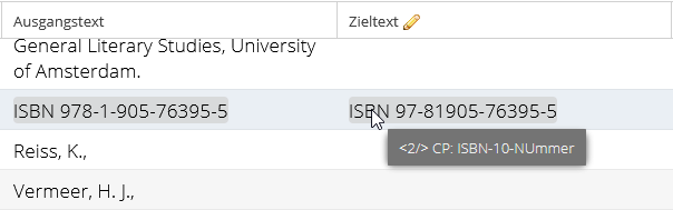 Wurden Content protection-Regeln erfasst und für bestimmte Quell- und Zielsprachen aktiviert, werden die entsprechenden Zeichen-/Zahlenfolgen in den danach erstellten Projekten gemäß den Regeln automatisch durch Tags geschützt und – sofern entsprechend definiert – in ein anderes Format umgewandelt.